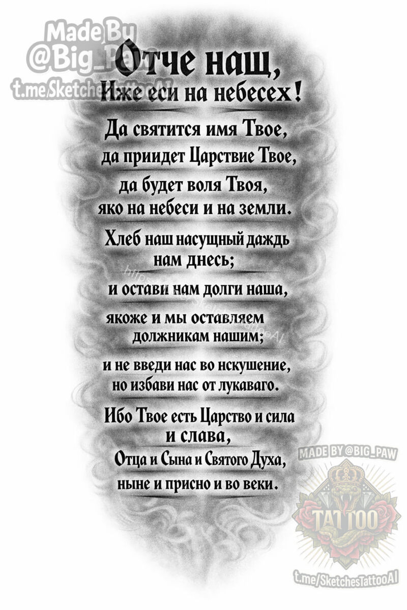 . Текст первой молитвы полностью как на фото 4, писать в промте на русском в разных стилях исполнения,без персонажей, что то на подобие второй и третей картинки. Без рваных эффектов и заворотов, что-то в стиле древней рукописи, больше теней можно) 🧠 SYNTX - тут создан эскиз 💎 Информация - все услуги 💀 Эскизы от нейросети 😎 Удалить тату #религия #молитва #текст #эскиз #тату #татуировка