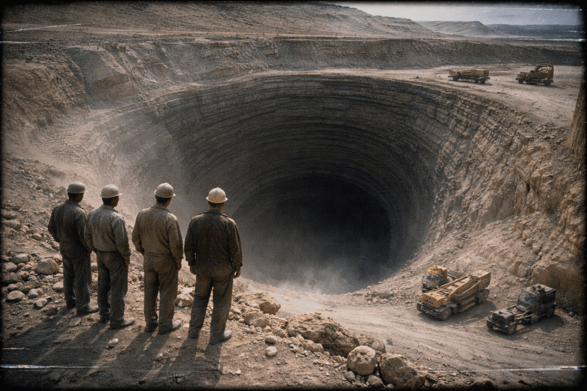 В 1965 году группа геологов работала в южной части Туркмении, где планировалось расширение карьера и детальная разведка глубинных слоёв. Район считался сложным, но в целом понятным: плотные породы, соляные пласты, старые тектонические трещины. Ничего, что выходило бы за рамки обычной практики, от участка не ждали. Работы шли по стандартной схеме — бурение, контрольные взрывы, расчистка, повторный замер. Первые странности начались после одного из контрольных подрывов. Вместо привычного осыпания породы вскрылась полость. Сначала решили, что это обычная карстовая пустота, которых в регионе хватало. Но когда расчистили вход, стало ясно: это не естественная каверна. Проём имел почти идеальную округлую форму, а его диаметр превышал размеры самой крупной карьерной техники, которая тогда использовалась на объекте. По воспоминаниям участников, внутрь свободно мог бы заехать самосвал, и ещё оставалось место по бокам. Когда начали обследовать полость, внимание сразу привлекли стенки. Они были гла