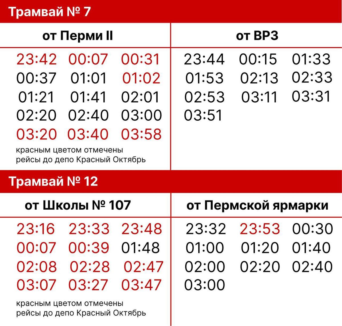 31 декабря транспорт будет работать по воскресному расписанию до 23:30. В новогоднюю ночь с 23:30 до 03:00 будут курсировать: Автобусы № 1, 2, 3, 6, 7, 10, 14, 15, 19, 20, 32, 36, 50, 51, 53, 67, 77, 78 и 81. Трамваи № 4, 5, 7 и 12. Вместо автобуса №72 будет работать трамвай №12. Карточки / департамент транспорта администрации Перми.