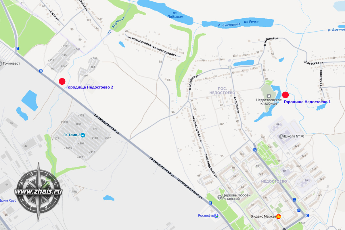 Не так давно мы рассказывали о городище Недостоево 1, расположенное в пределах современной Рязани, и в той же публикации упомянули и про другой памятник археологии, который, в уже известной нам работе "Материалы для археологической карты долины р. Оки" (Труды XII Археологического съезда, т.1, 1905 г.), В. Городцов описывает следующим образом: "К западу от с. Недостоево, в расстоянии около версты, на земле церковнослужителей находится второе городище. Я его не видал и сведения о нем получил в селе Городищах от священника о. Витушина, по словам которого, это городище значительно обширнее первого, расположено между двумя оврагами и с напольной стороны окружено тремя или даже четырьмя валами, которые однако за последнее время все раскопаны и запаханы, так что от них сохранились лишь одни следы." Если же обратиться к "Археологической карте России. Рязанская область" (1994 г.), то там мы действительно обнаружим "Недостоево. Городище 2" : "Расположено около 1 км к юго-западу от северо-запад