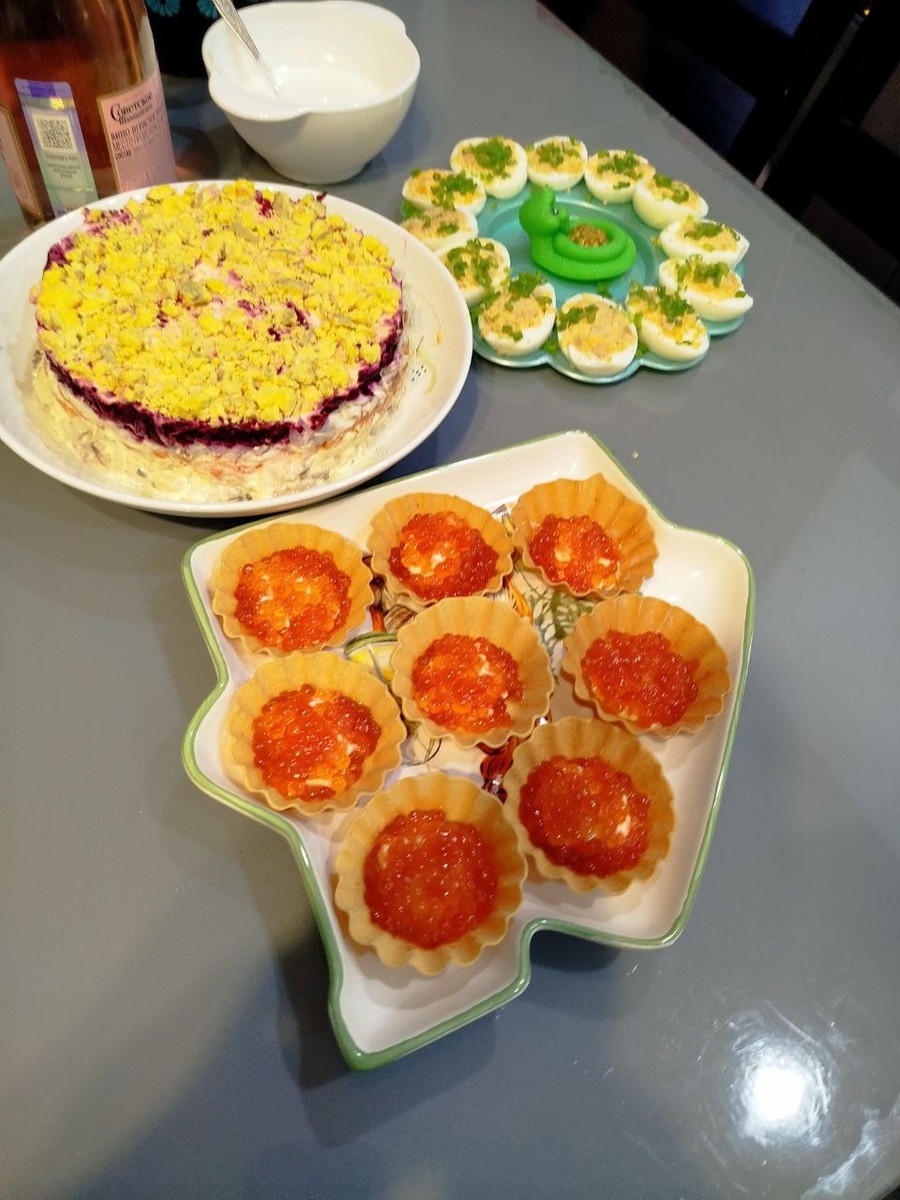 😊 Было очень много всего вкусного. 😋 ✅ Голубцы ✅ Селедка под шубой ✅ Тарталетки с творожным сыром и икрой ✅ Чаёк зелёный с жасмином и тортиком Киевским и Наполеоном. Пусть всё у вас у всех будет хорошо. 👍 Пусть уходящий год уносит с собой всё плохое, а новый 2026 год приносит всё только хорошее. 😊