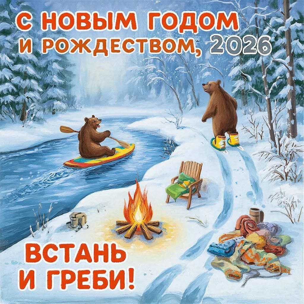 ! Представьте себе: снежный лес, мерцающие огоньки костра, тепло уютного зимнего вечера... А рядом верные друзья, готовые отправиться вместе с вами навстречу новым свершениям и радостям. Новый год станет особенным, полным неожиданных встреч, захватывающих путешествий и вдохновляющих моментов. Пусть каждый день дарит новые открытия и счастье, которое согревает сердце даже в самые холодные дни. Желаем Вам смелости идти вперед, верить в мечту и наслаждаться каждым мгновением. С наступающим Новым годом и светлым Рождеством! Вперёд, навстречу приключениям 2026-го! Встань и Греби!