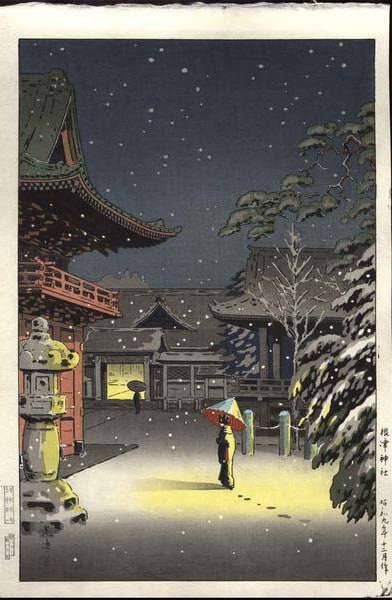 Год, что должен уйти, Опечален грядущим уходом. Вместе с ним я грущу— Словно тени на лик зерцала Набегают воспоминанья… Ки-но Цураюки; Кокинвакасю. Перевод с японского языка выполнен А.А. Долиным. Гравюра: Цутия Коицу; «Девушка идет по снегу в святилище Нэдзу»; 1934 г. #大和の歌