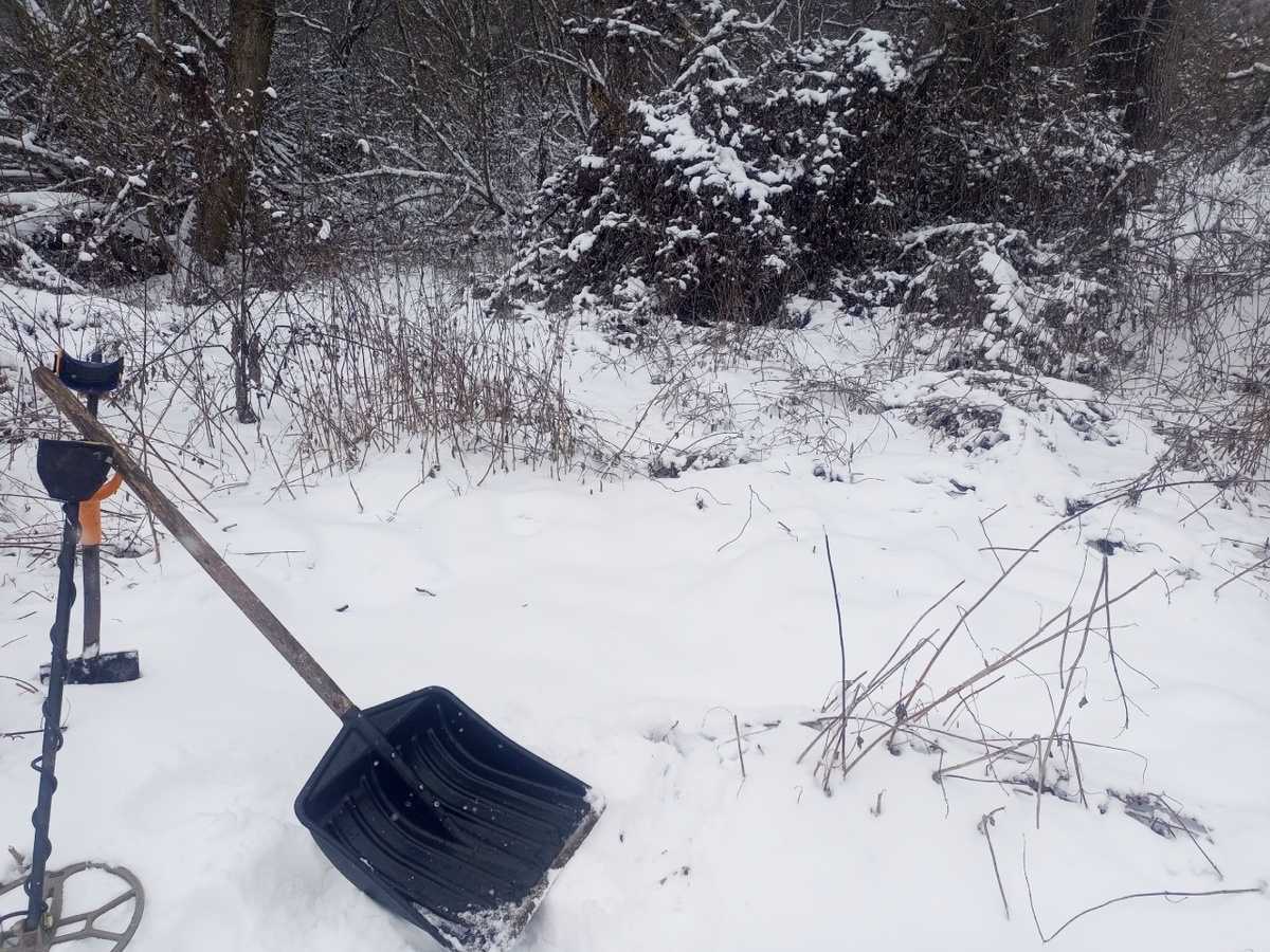 Ну конечно перед этим попробовал землю на промерзание. И как бы повезло, земля взялась небольшой коркой, которую можно в прыжке на лопату пробить)). Коп конечно усложнился. Начал расчищать свой плацдарм, где-то 4 на 4 участочек. Вот так он выглядит практически без снега. Да и снега не очень много было см 12-15.
