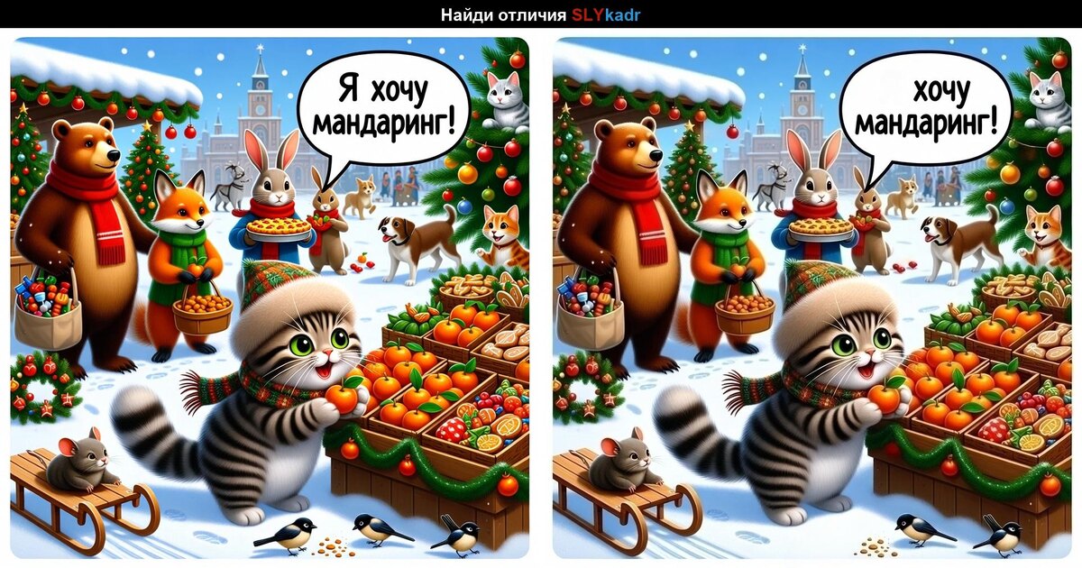 Приветствуем вас на канале 'Хитрый кадр' в Дзен! Сегодня мы приготовили для вас новогоднюю игру на внимательность. На этой ярмарке, где царит зимнее волшебство, спрятались 6 отличий! Сможете ли вы их найти? Погружайтесь в праздничную атмосферу и проверьте свою внимательность! Поздравляем, если вы нашли все отличия! Поделитесь вашим результатом в комментариях! Если вам понравилась игра, не забудьте подписаться на наш канал 'Хитрый кадр' и ставить лайк. Впереди еще много увлекательных загадок и игр, ждите новых выпусков! Отгадка ниже. 🎄