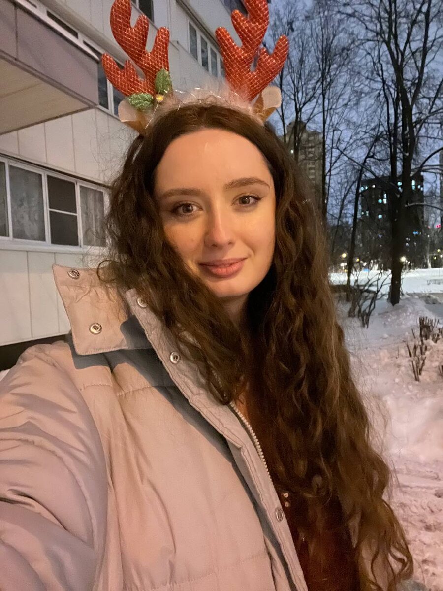 Сегодня отмечаю факт, что странно-нарядная тетенька, идущая в гости с мартини и подарочками (уже в третьи гости за день 🙂) — это уже не какая-то чужая мадам, а очень даже я! А за кадром кринжующий от моих оленьих рожек Артём, развозящий меня по гостям