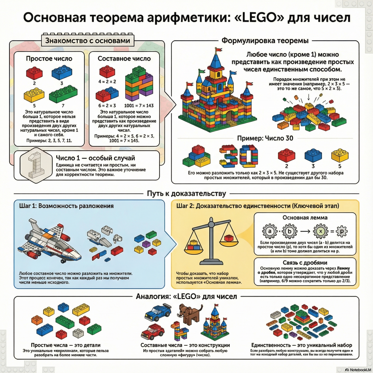 Ключевая идея теоремы заключается в следующем: как бы вы ни разбирали свою собранную «фигуру» (составное число), вы всегда получите один и тот же набор исходных «деталей» (простых множителей). Невозможно разобрать число 12 и получить, скажем, набор из троек или пятерок. Набор деталей предопределен и уникален для каждой фигуры.