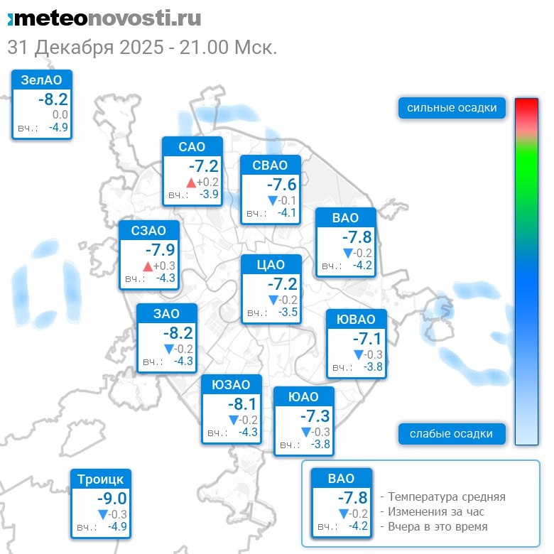 В 21:00 в Москве было от -9.6°C до -6.5°C, средняя температура -7.7°C #погода #Москва #зима #температура #31декабря #среда