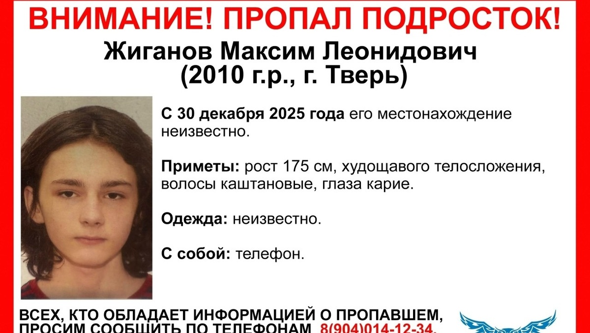 В Твери пропал Максим Леонидович Жиганов 2010 года рождения. Как сообщает тверской волонтерский поисково-спасательный отряд "Сова", местонахождение несовершеннолетнего неизвестно с 30 декабря. Приметы: рост 175 см, худощавого телосложения, волосы каштановые, глаза карие. Одежда: неизвестно. С собой: телефон. Информацию о пропавшей нужно сообщать в отряд по телефонам: 8 (910) 646-34-34 и 8 (904) 014-12-34. Напомним, ранее в Твери ушла и пропала 13-летняя девочка. Ребенка искали волонтеры и правоохранительные органы, девочка 31 декабря самостоятельно вернулась домой.