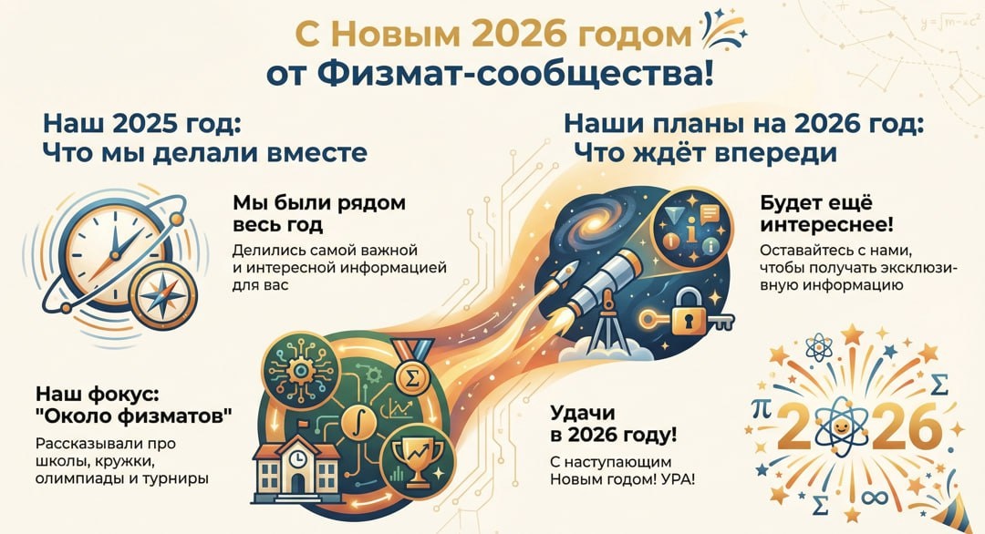 ! Мы были рады провести 2025 год вместе с Вами! Мы стараемся публиковать самую интересную и важную информацию про физико-математические школы Санкт-Петербурга, а также кружки, олимпиады, турниры и другие важные события "около физматов". Оставайтесь с нами в 2026 году и мы поделимся с вами еще более интересной информацией! Удачи в 2026 году! С наступающим Новым годом! УРА!