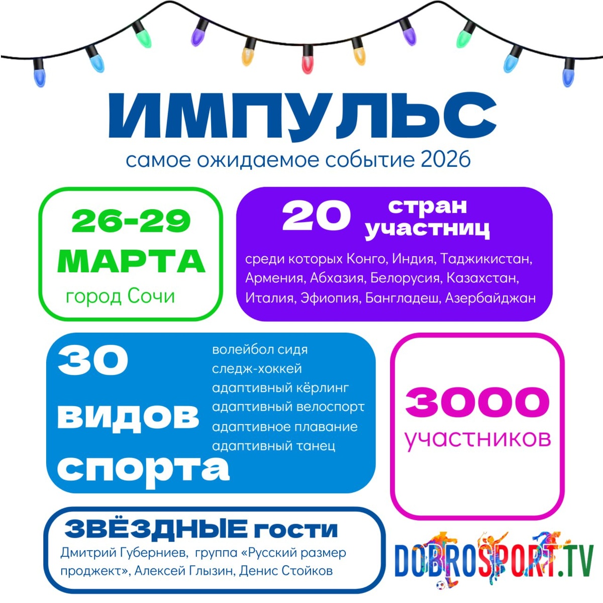 ! Сегодня в волшебную ночь, когда весь мир подводит итоги и загадывает желания, мы смотрим вперёд с особым волнением и твёрдой уверенностью. 🎄Мы не просто ждём нового года — мы активно готовимся к нему. 2026-й для нас — год грандиозного спортивного события, которое станет символом единства, силы духа и безграничных возможностей. Уже в марте 2026 года наша страна распахнёт двери для III Международного фестиваля адаптивных видов спорта «Импульс» — масштабной площадки, созданной в рамках федерального проекта «Спорт России». Представьте эту энергию: атлеты с разными историями, говорящие на разных языках, объединённые одной страстью и одной целью — показать, что невозможное возможно. 💫 Это шаг к тому, чтобы Россия стала центром притяжения для настоящих героев со всей планеты. Так что пока бьют куранты, мы знаем: впереди — год ещё большего единства, вдохновения и ярких побед. 🤩 2026-й будет громким. 2026-й будет «Импульсом». С наступающим Новым годом, друзья! Ждём вас с нами в этом