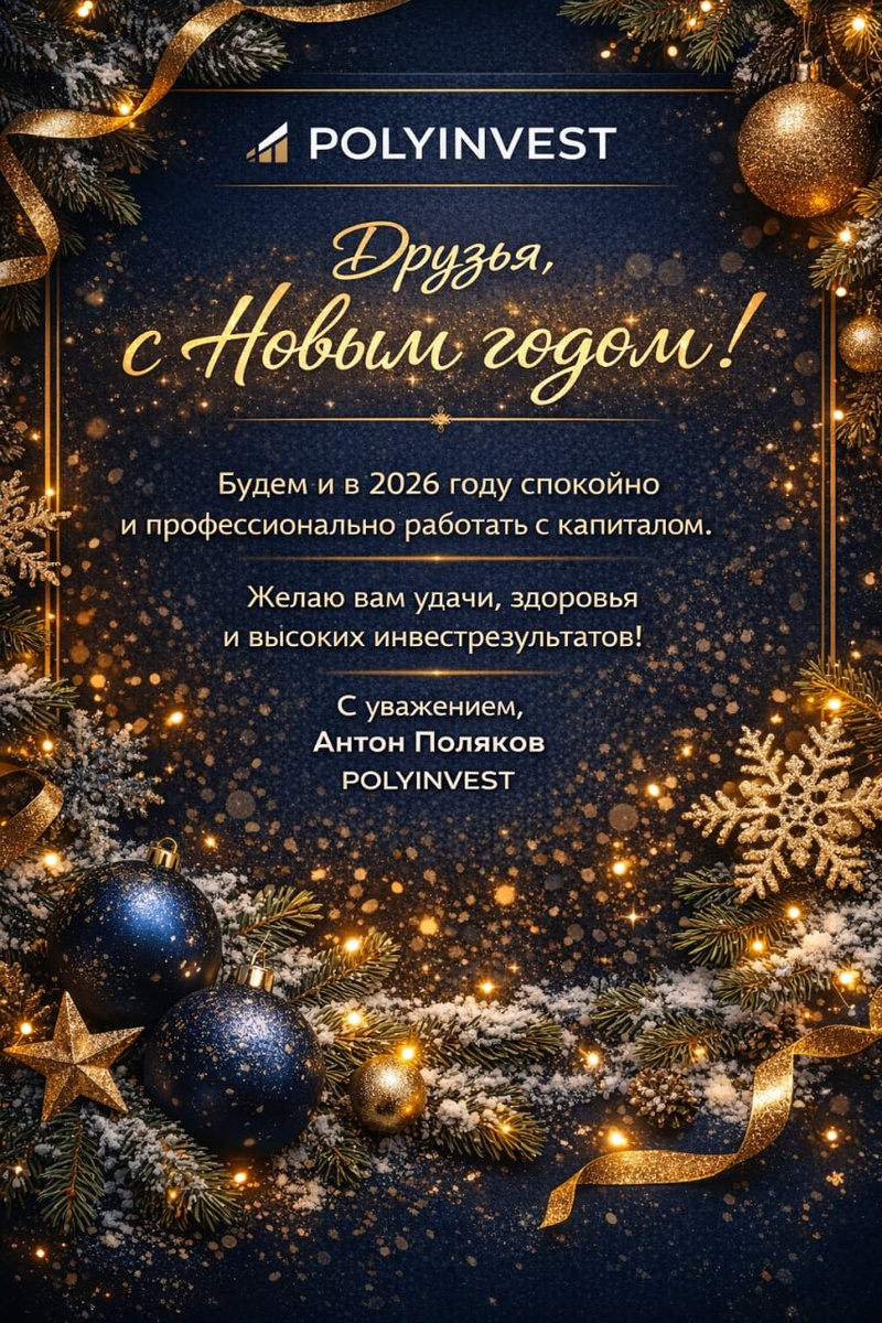 ! Желаю вам крепкого здоровья, финансовой устойчивости и высоких инвестиционных результатов. Прошедший год мы закрыли уверенно — наши портфели показали результат существенно лучше рынка, и это стало возможным благодаря дисциплине, своевременным решениям и вашему доверию. Рынок постепенно выходит из затяжного боковика, впереди — новый этап, который откроет как возможности, так и вызовы. Я продолжу внимательно следить за макроэкономикой, ставкой и настроениями рынка, чтобы принимать взвешенные решения и защищать ваш капитал. В новом году нас ждёт много работы, новых идей и важных шагов в развитии. Благодарю вас за то, что вы со мной, и за готовность мыслить на дистанции, а не в моменте. Пусть 2026 год будет для вас успешным, спокойным и прибыльным.