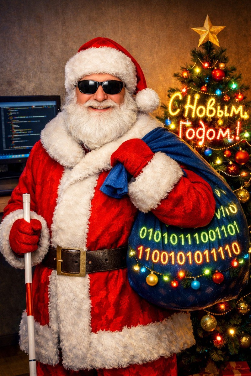 ! Как вам в 2026? Мне нравится 😊. А если вы ещё не здесь, подождите: скоро придёт 😊. Желаю вам здоровья крепчайшего - это самое важное. Исполнения всех желаний, счастья и радости, удачи и успеха в делах и по жизни, роста во всех сферах и энергии на имеющиеся дела, Наличия мечт и воплощения их в цель с последующим их достижением 😊. С новым годом! P. S. Изображение создано Chat GPT по следующему промпту: Создай новогоднее изображение: Дед мороз стоит с белой тростью незрячего и в тёмных (символ того, что он незрячий) очках. Справа от него ёлка с гирляндой, лампочки которой написали "С новым годом!" Сзади деда мороза виднеется компьютер. А на мишке с подарками, что дед мороз держит в правой руке, написаны нули и единицы, символизируя программирование. Лицо деда мороза улыбается. 😎 Незрячий web3 программист (подписаться) Чат | бот