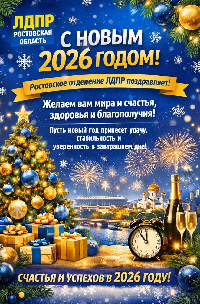 ! ❄️Мы вступаем в новый, 2026 год — год новых задач, надежд и ответственности за будущее нашей страны и родного Донского края. Уходящий год был непростым, но он показал главное: только вместе, поддерживая друг друга и оставаясь верными своим ценностям, можно преодолевать любые трудности. ✨✨✨ Ростовское региональное отделение ЛДПР поздравляет жителей Ростовской области с Новым годом! Мы желаем каждому дому мира и уюта, каждой семье — здоровья, тепла и уверенности в завтрашнем дне. Пусть новый год принесёт стабильность, новые возможности, исполнение желаний и веру в собственные силы. ❄️ Пусть 2026 год станет временем добрых перемен, созидательной работы и взаимной поддержки. А мы, как и всегда, будем рядом с людьми, защищать их интересы и добиваться справедливых решений. ❄️ С Новым годом! Счастья, благополучия и добра вам и вашим близким! Дорогие подписчики, благодарим Вас за поддержку! Ваши реакции, приглашения друзей и репосты позволяют нам развиваться. Не забывайте ставить 👍👍👍