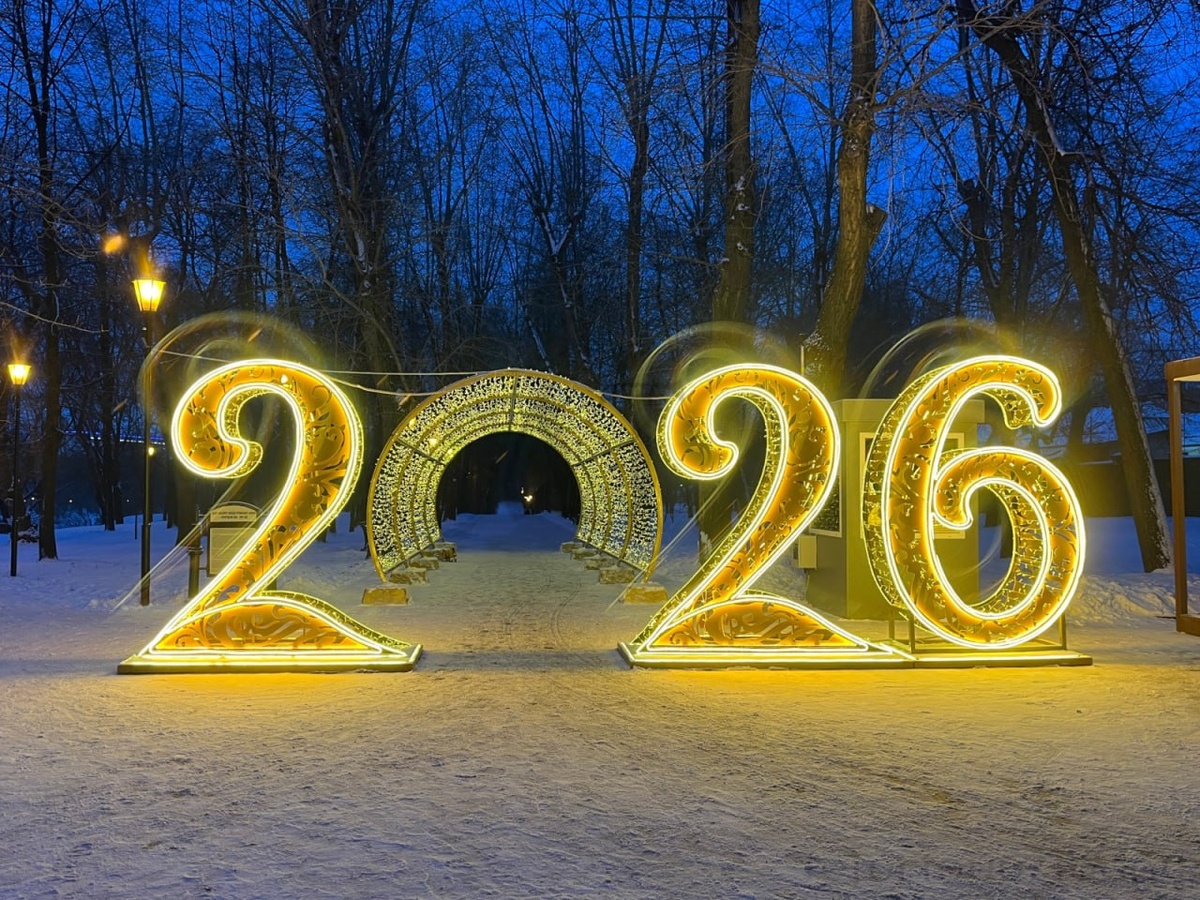 У входа в парк (со стороны Красноказарменной улице) установлены цифры 2 и 26 из световых панелей, а цифру 0 заменяет "тоннель" из множества гирлянд. Источник: архив lefortovo_today