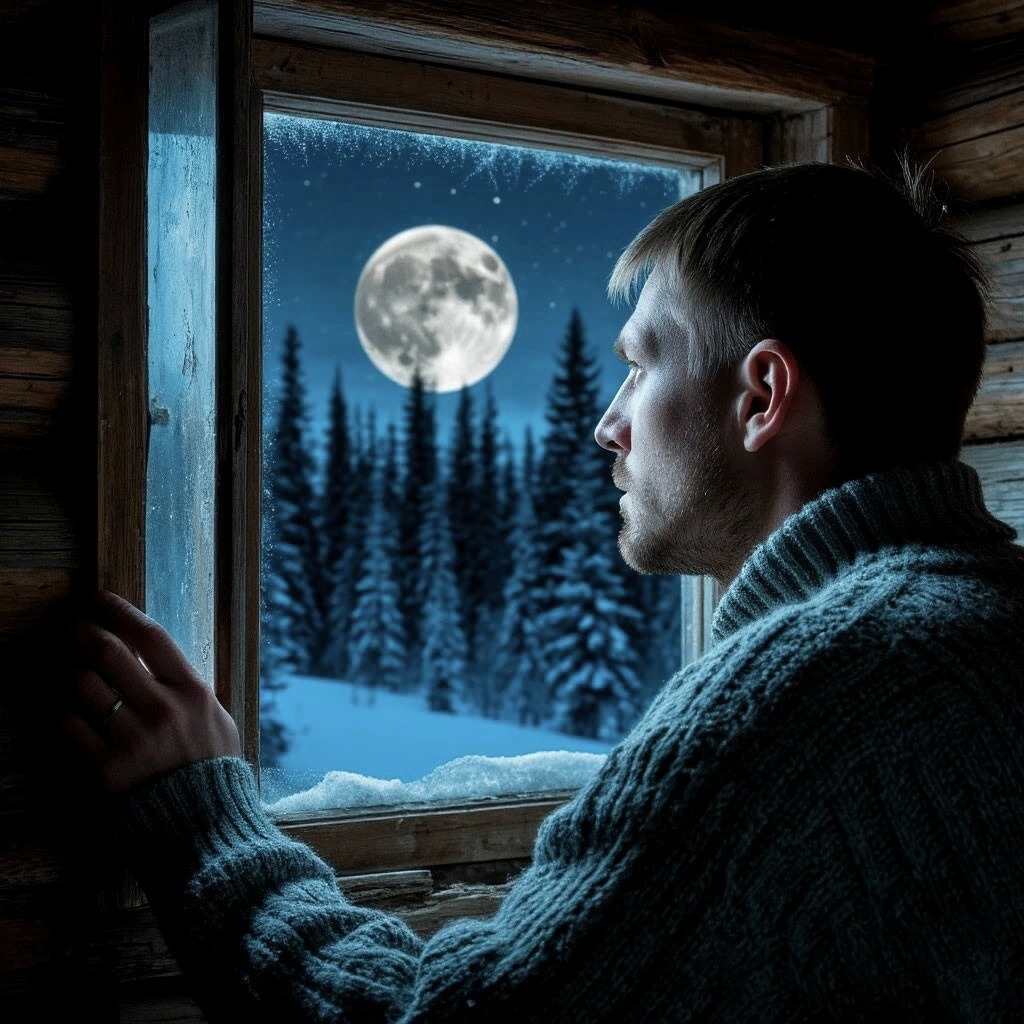 Роман слегка отодвинул полотенце, служившее занавеской, и выглянул в окно. Как светло! Лунный свет заливал лес, чётко очерчивая предметы. За кронами деревьев сияла почти полная луна, превращая унылый пейзаж зимнего леса в сказочный, наполняя загадкой каждый угол. Но что это? Тёмная тень, которую Роман принял за обломанный ствол сосны, шевельнулся, и поднялся на ноги! Он не успел рассмотреть фигуру, но было такое впечатление, что некто, сидевший на корточках, встал и выпрямился во весь рост.