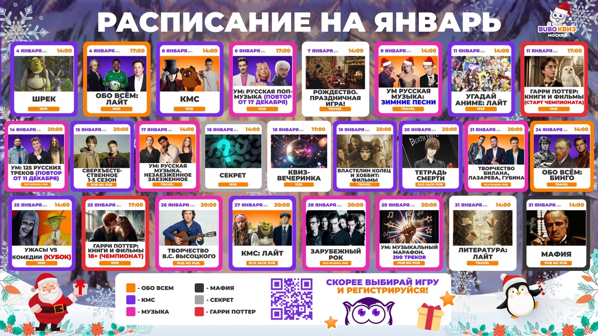 Думаете, на какие квизы сходить в январе 2026 года в Москве? Bubo-Квиз проводит 24 разнообразных квиза в Москве, в том числе запускает Чемпионат по Гарри Поттеру!