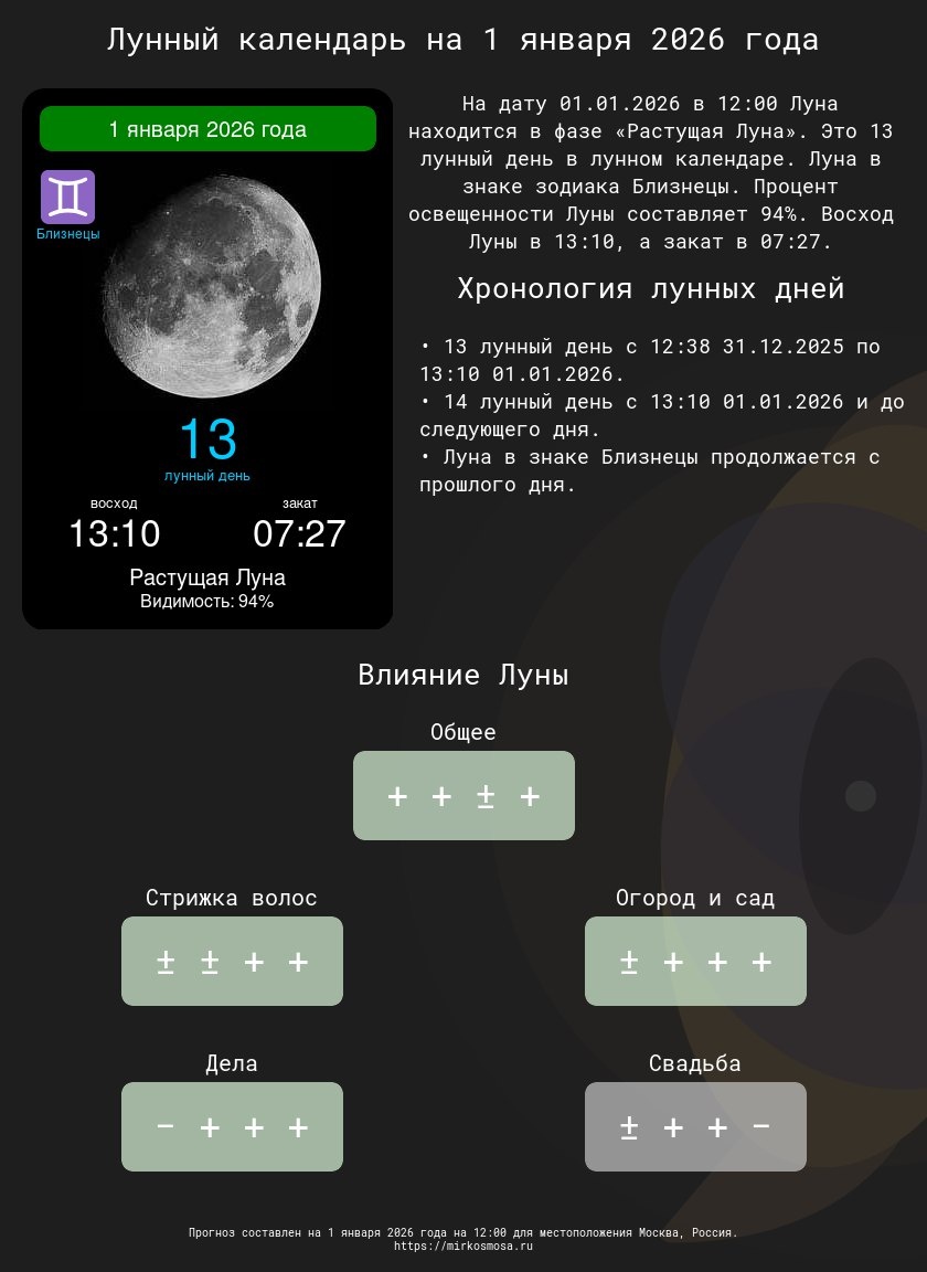 ! 🔹🌗 Лунный календарь на 1 января 2026 года — Что приготовила Луна? Подробнее 🔹✂️ Лунный календарь стрижек на 1 января 2026 года — Подходящий ли день для обновления прически? Подробнее 🔹🌱 Лунный календарь огородника и садовода на 1 января 2026 года — Лучшее время для ухода за растениями. Подробнее 🔹📅 Лунный календарь дел на 1 января 2026 года — Удачные моменты для важных задач. Подробнее 🔹💍 Лунный календарь свадеб на 1 января 2026 года — Подходит ли этот день для вашего торжества? Подробнее