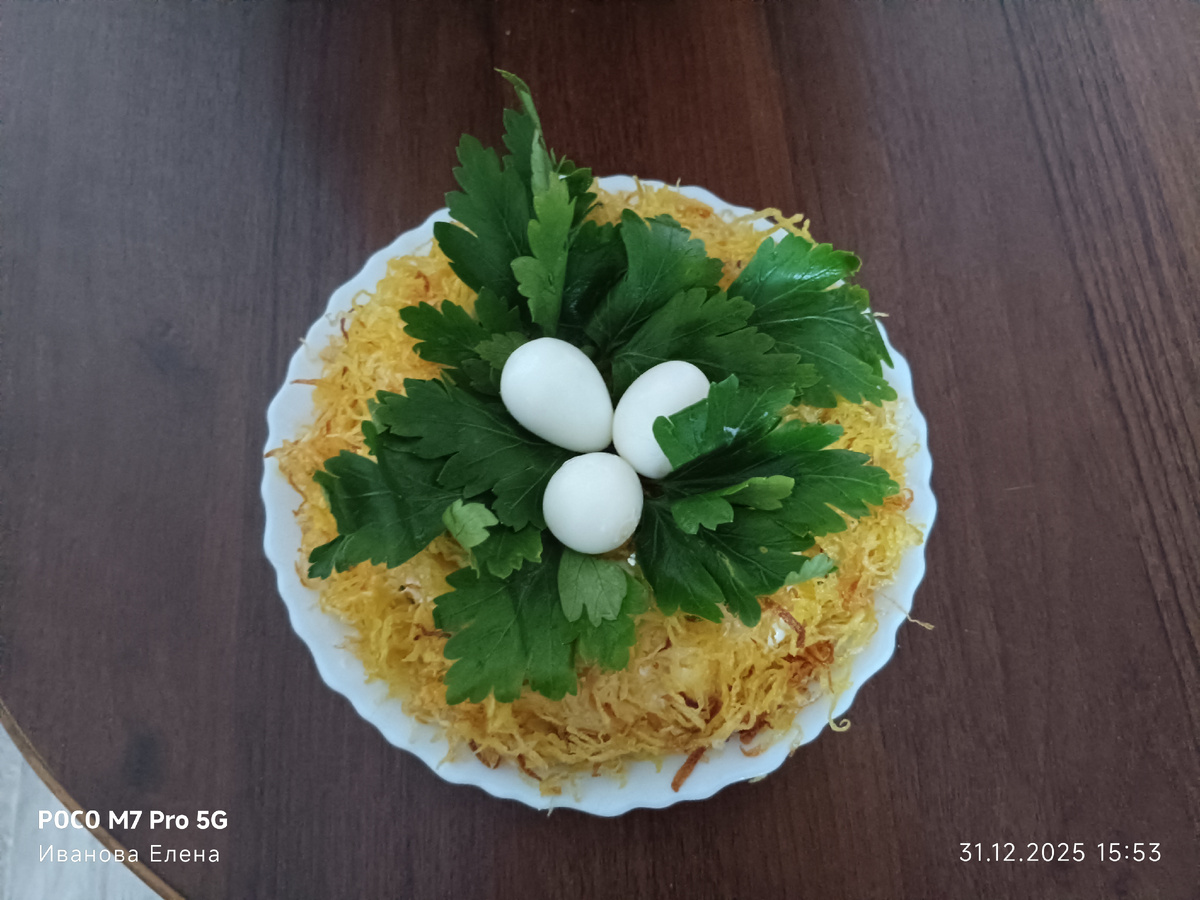 «Гнездо глухаря» появилось на свет в начале 2000-х годов — и его родиной стал не дремучий лес, а уютный подвальчик в Москве, где собирался клуб бардов «Гнездо глухаря». Интерьер заведения, вдохновлённый песней Олега Митяева, изображал лесную поляну с глухарём на ветке. Вот и салат решили назвать в честь клуба — а заодно и обыграть форму гнезда с «яйцами» в центре. Так что, если вы когда-нибудь мечтали отведать блюдо, рождённое в атмосфере гитарных переборов и поэтических вечеров, — вот он, ваш шанс! Состав «Гнезда глухаря» напоминает сборную солянку из всего, что нашлось в холодильнике у рачительной хозяйки: у меня огурцы соломкой, филе, разобранное на волокна, яйцо на терке, мелко рубленный лук и майонез. Из этого делается шар, в нем углубление. Аккуратно все обкладывается картофелем пай, украшается перепелиными яйцами. В этом году я впервые с ними связалась, с этими яйцами, измучилась их очищать. Слоеный салат: запеченное мясо, грецкие орехи, жаренные грибы, яйца и сыр. Очень нежный