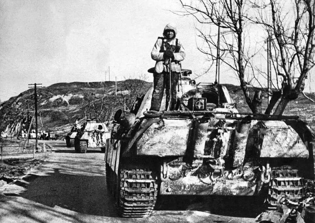 «Пантеры» из штабной роты, I-го батальона, 3-го танкового полка СС «Тотенкопф» к востоку от Ньергесуйфалу, начало января 1945 г.
