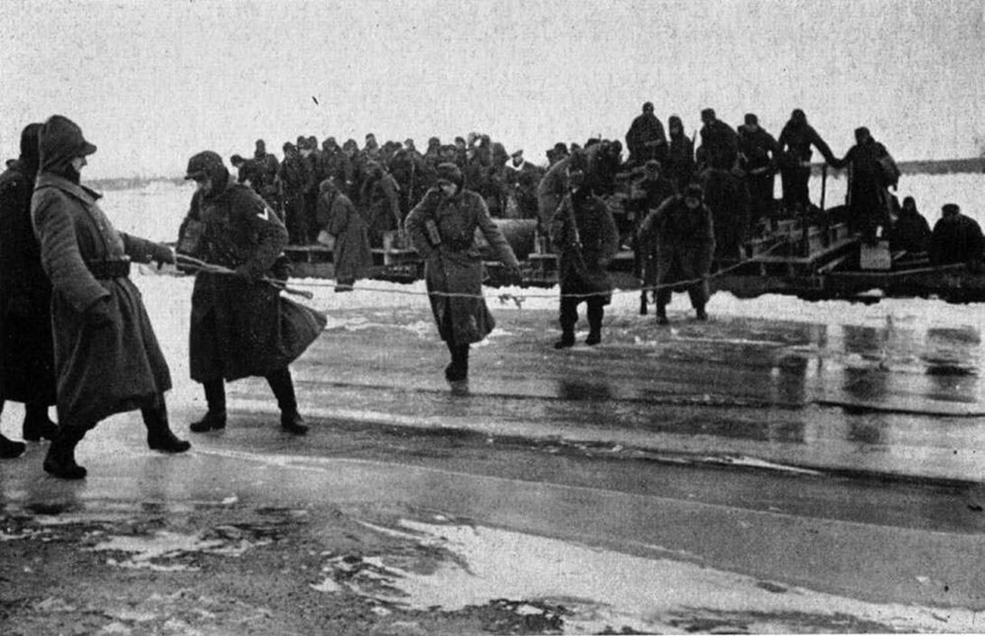 Войска 96-й пехотной дивизии переправляются через Дунай на пароме после захвата южного берега реки между Граном и Ньергесуйфалу в начале января 1945 года.