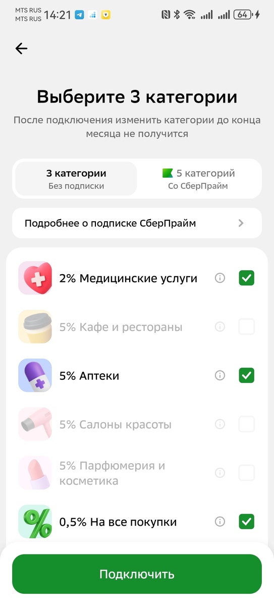 Пришла пора выбирать кешбэк на январь 2026 года. Начинаю с карты Сбера. Можно выбрать 5 категорий с подпиской СберПрайм, но у меня её нет. Соответственно, выбираю 3 категории. Это 0,5% на все покупки, 2% на оплату медицинских услуг и 5% на покупки лекарств в аптеках. Неудобно то, что кешбэк начисляется в бонусах Спасибо, а не в рублях. Потратить их можно на покупки у партнёров, на компенсацию части оплаты за ЖКУ или перевести близким. Можно конвертировать в рубли, но по невыгодному курсу: 2 бонуса Сбеспасибо = 1 рублю. Кешбэк начисляется в рублях за покупки от 1 рубля, даже за булку хлеба в магазине. Выбрала 1% на все покупки, 1,5% на покупки в супермаркетах, по 5% на оплату в городе (в основном, в такси по городу) и за здоровье и красоту. Привычная категория на выбор - кешбэк за оплату услуг ЖКХ. Есть предложение на покупку лекарств в аптеках и супермаркетах. Выбор приличный! Останавливаюсь на 1% за все покупки, по 2% за аптеки и медицинские услуги и за покупки в супермаркетах. Ещё в