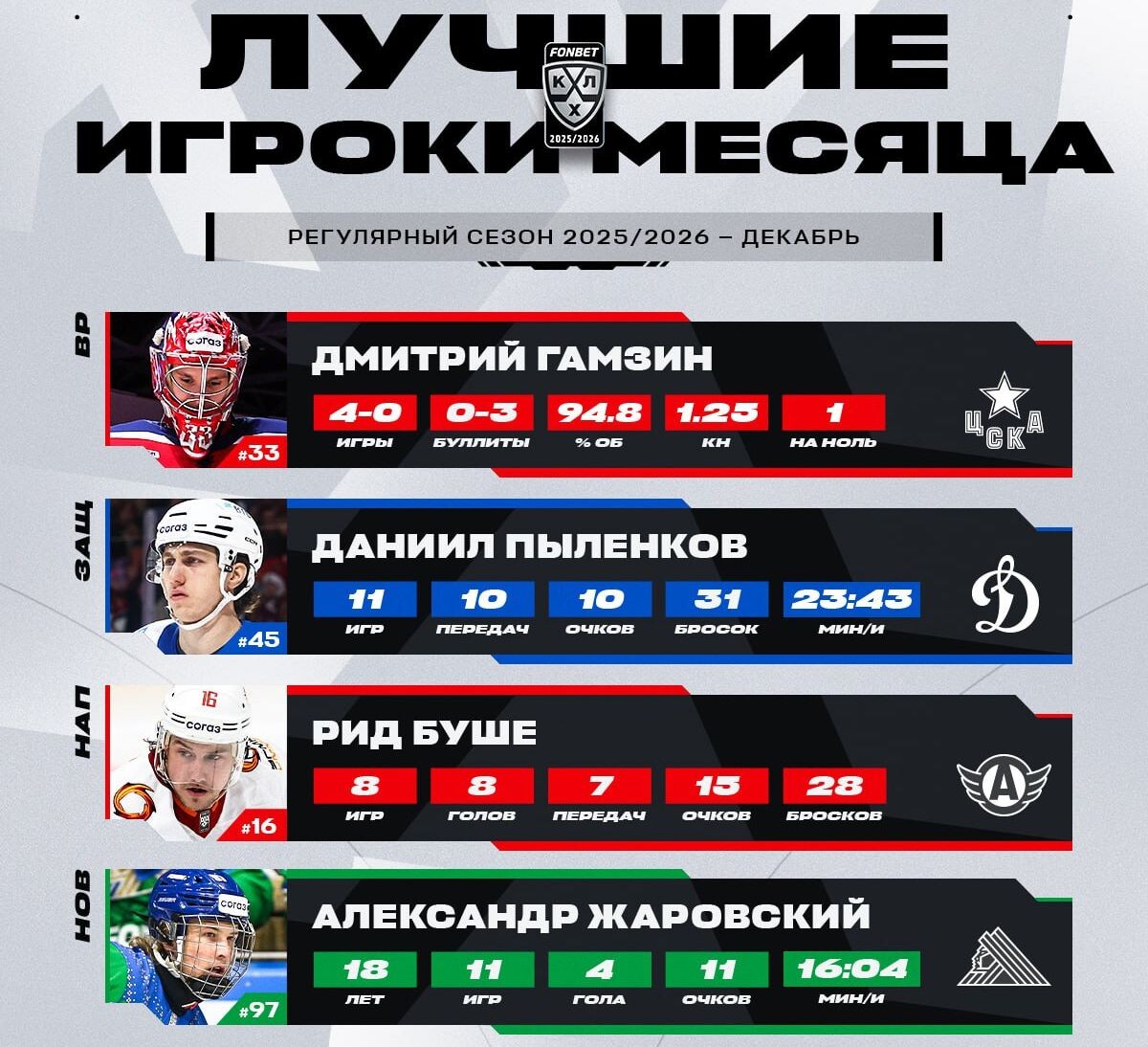 1 января 2026 года Континентальная хоккейная лига (КХЛ) подвела итоги декабря и объявила лауреатов в четырёх ключевых номинациях. Победителей определила специальная комиссия на основании: 1. Лучший вратарь — Дмитрий Гамзин (ЦСКА)