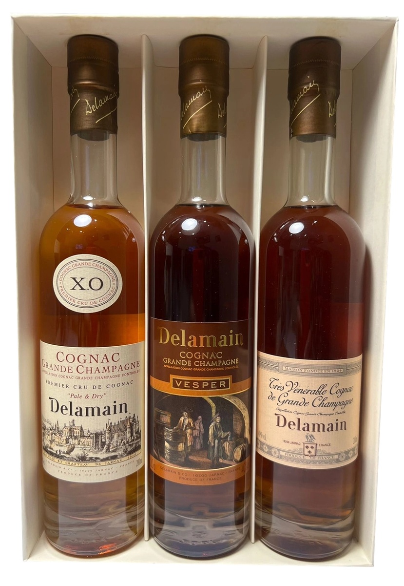 Деламейн, трес венерабль, Франция, Гранд Шампань, класс коньяка тре вье, выдержка 50 лет, сорта винограда: уни блан, коломбар, крепость 40%, объëм 200 мл.