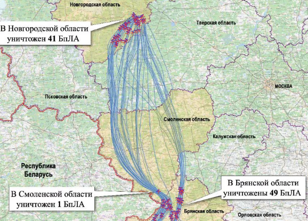 В качестве вещественного доказательства атаки на резиденцию президента РФ Министерство обороны РФ опубликовало карту маршрутов пролёта украинских боевых беспилотников над территорией страны. Лучше бы они этого не делали. Смотрим на карту. В Брянской области ПВО сбито 49 БпЛА. Сразу вопрос – а почему не сбили все сразу? Вот они летят двумя потоками. Их обнаружили, но половину пропускают. Не хватило средств ПВО? Это в приграничье. И тут они широким потоком разлетаются по Смоленской области. Сбит один. Свободно, спокойно, не торопясь долетают до Тверской области. Тут «халявы» ещё больше. Маневрируют, перестраиваются как хотят. И только на подлёте к резиденции президент РФ встречаются с глубокой эшелонированной обороной ПВО. На схеме видно три области поражения БпЛа в Новгородской области. Следовательно, как минимум три кольца ПВО охраняет резиденцию президента. И то за малым немного не добрались до цели. Снова вопросы. Тверская и Смоленская области беззащитны перед налётами? Там нет ПВО?