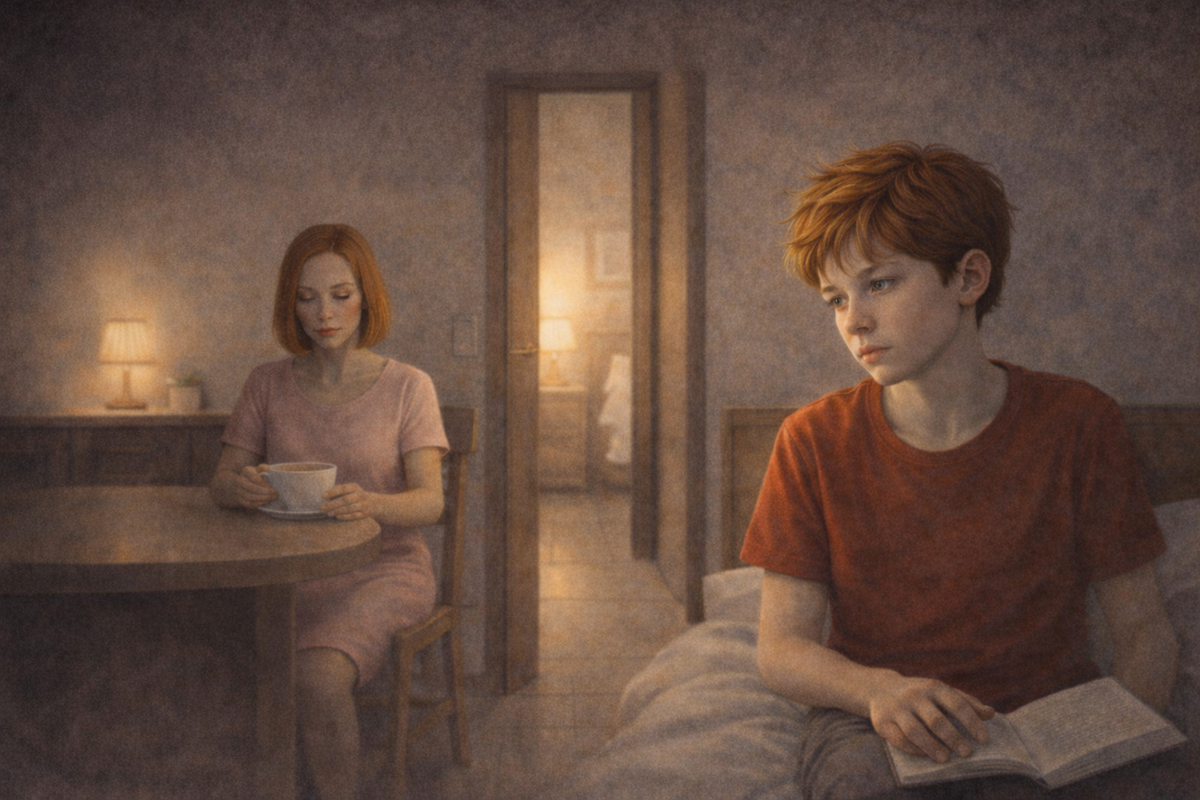 К вечеру Дима поймал себя на том, что старается не ходить по квартире без необходимости. Не потому что боялся — это было бы проще. Скорее потому, что любое движение требовало решения: куда поставить ногу, как повернуть плечо, сколько места занять. Как будто пространство больше не прощало неточностей. Мама почти не выходила из кухни. Он слышал её присутствие не по шагам — шагов почти не было, — а по тому, как менялась плотность тишины. Когда она вставала, воздух становился собраннее. Когда садилась — чуть отпускал. Дима сел за стол, открыл тетрадь и попытался делать уроки. Слова складывались правильно, но смысл ускользал. Он перечитывал задания снова и снова, пока не понял, что просто тянет время. Когда делать будет нечего, придётся снова думать о квартире. Он встал и прошёл в коридор. Свет был включён, но лампа горела иначе — ровно, без привычного мерцания. Тени лежали аккуратно, будто их заранее расставили. Дима остановился и вдруг понял, что не может вспомнить, включал ли свет сам. О