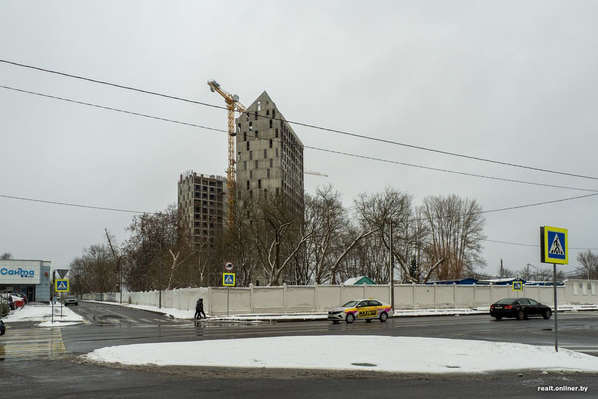 Дом переменной этажности, отгородившийся от проспекта Победителей голубыми высотками, строится довольно активно. В новый год ЖК вошел с полностью выведенным монолитным каркасом (25, 16 и 12 этажей), поспевающей за ним каменной кладкой и тюками утеплителя на стилобате. Остекления мы не заметили, но зато оригинальные «заостренные» балкончики уже огорожены керамзитобетоном.