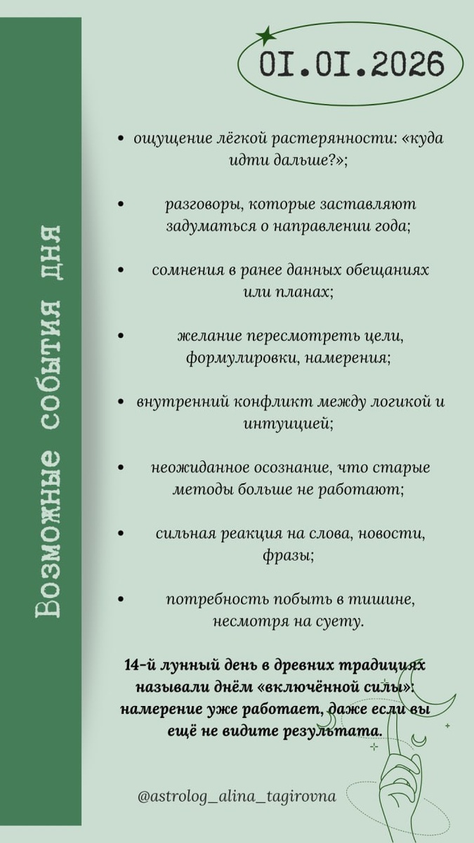 1️⃣ января, четверг В 13:16 начало 1️⃣4️⃣-го Лунного дня Растущая Луна в знаке ♊Близнецы Общая характеристика дня Первый день нового года начинается с настройки маршрута, а не с рывка. 14-й лунный день считается одним из самых энергетически сильных — днём намерения, вектора и запуска внутреннего импульса. Но сегодня он проживается не через прямое действие, а через осознанный выбор мышления. Луна в Близнецах поднимает вопросы: ➡️как я думаю?! ➡️какие слова я выбираю?! ➡️какие истории о себе повторяю?! Квадратуры к Лунным узлам создают ощущение внутренней развилки. Старые ментальные шаблоны (Южный узел в Деве) — анализ, контроль, сомнения — сталкиваются с задачей нового года: доверие, интуиция, принятие неопределённости (Северный узел в Рыбах). Это день, когда: ум хочет всё понять и разложить, душа просит отпустить и почувствовать, будущее зовёт мягко, а прошлое цепляется привычками Важно помнить: напряжение кармических узлов — не ошибка, а точка роста. Вопросы дня: ❓Какие мысли я