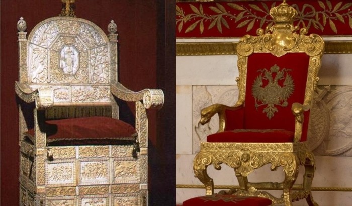 Трон, или, как его еще называли, царский престол, поистине являлся одним главных символов власти. Благодаря традициям Византийской империи в России начали также украшать царское кресло как можно богаче и шикарней. Причем у русских правителей, как правило, было сразу несколько тронов. Это было вызвано тем, что царский престол находился в залах для приема посетителей и гостей, во всех дворцах правителя, ну и конечно же, в Успенском соборе Кремля, ведь там и происходило священное коронование русских царей.