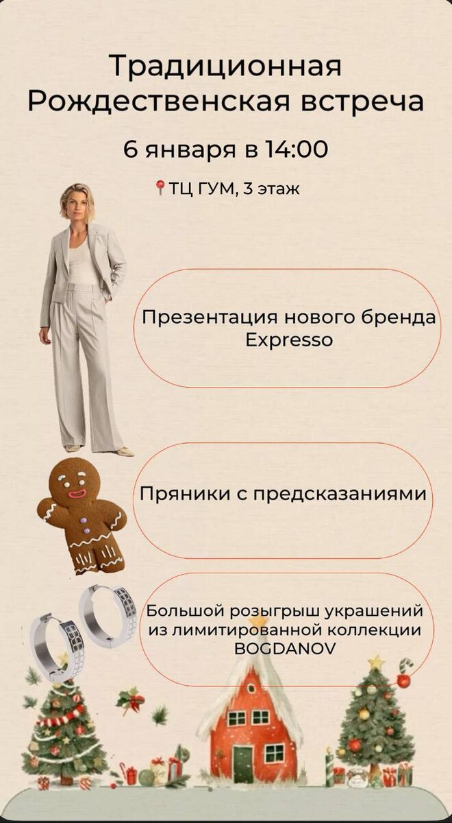 🎁 У нас очень много подарков , которые мы разыграем 6 января в 14.00 в нашем салоне Хорошо 🔔Шикарные календари , 🔔шоперы, 🔔милые бархатные новогодние игрушки от Богданова , которые могут стать игольницами 🔔Ну а главный сюрприз Украшения ALEXANDER BOGDANOV лаконичные, осмысленные, с символами бренда! Серьги и браслет с обновленным логотипом в виде символа бесконечность🎄 📍6 января в 14.00 мы ждём вас на наших уже традиционных Рождественских встречах 🎄🎄🎄🎄 Как всегда у нас будут гадальные пряники 🍪 Глинтвейн🕯 🌟А главное презентация абсолютно нового бренда Expresso, межсезонная коллекция , которая легко впишется в ваш зимне весенний гардероб! 📍ТЦ ГУМ, 3 этаж