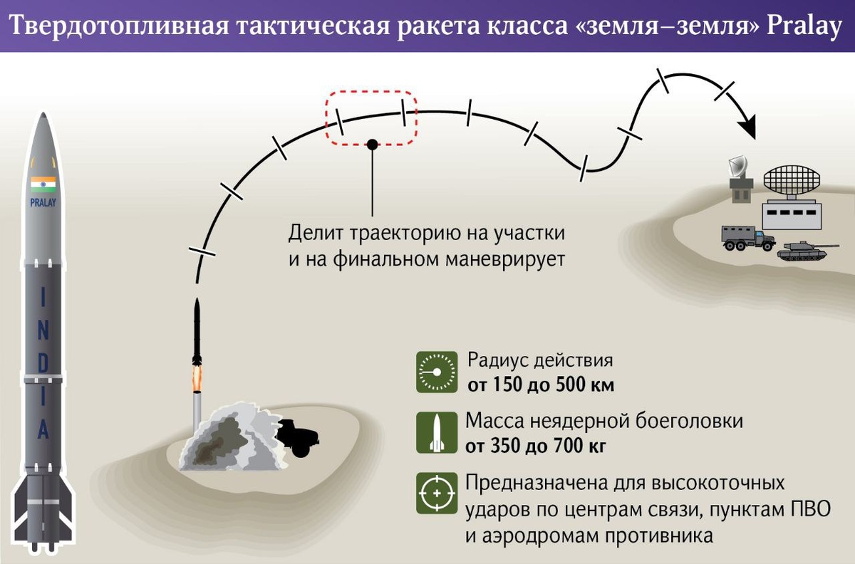 Особенностью стал запуск двух ракет подряд с одной пусковой установки. Ракеты Pralay располагают 2 ступенями с твердотопливными ракетными зарядами. При этом, отделяемая ГЧ индивидуального наведения располагает инерциально-навигационным блоком, модулем GPS-коррекции, а также опционально может оснащаться активно-пассивной РГСН для поражения радиоконтрастных и радиоизлучающих объектов. Управление ГЧ на терминальном отрезке траектории может осуществляться посредством складных решетчатых аэродинамических рулей. Скорость полёта по завершении активного участка траектории достигает 6480 км/ч, в то время как скорость болёта маневрирующей ГЧ может составлять 1300 - 850 м/с. Масса боевой части варьируется от 350 до 750 — 1000 кг, от чего зависит дальность действия изделия. Евгений Даманцев https://dzen.ru/id/6425916a1950720421f18802