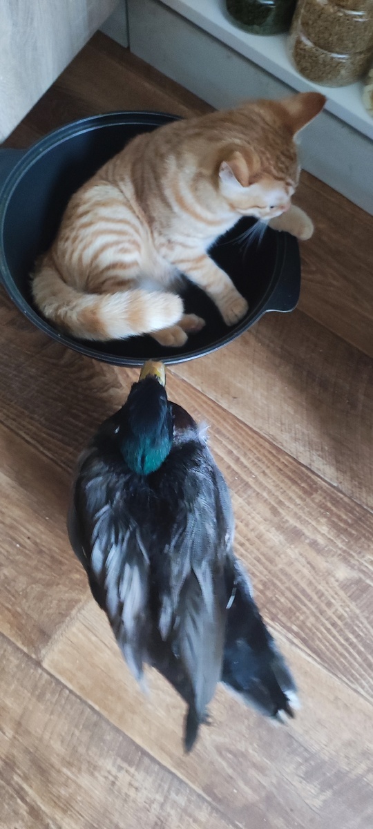 Открыла стол, туда сразу забрались котята. Достала казан, потянулась за крышкой. И тут такая вот картина. Мурзик нырнул в казан, строгий Гоша заворчал. Стал выгонять. Конечно, я это сфотографировала. Ещё и