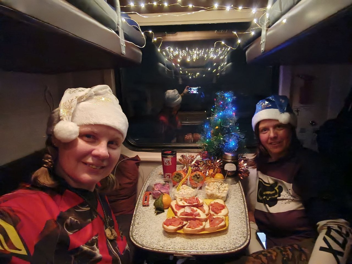 🎄 🛤️🚂 Без приключений не получилось 😂, но так запомнится лучше, опоздание нашего поезда 🚂 на утро 1 января 5,5 часов. Едем домой. Вагон пустой нас 6 человек 😊