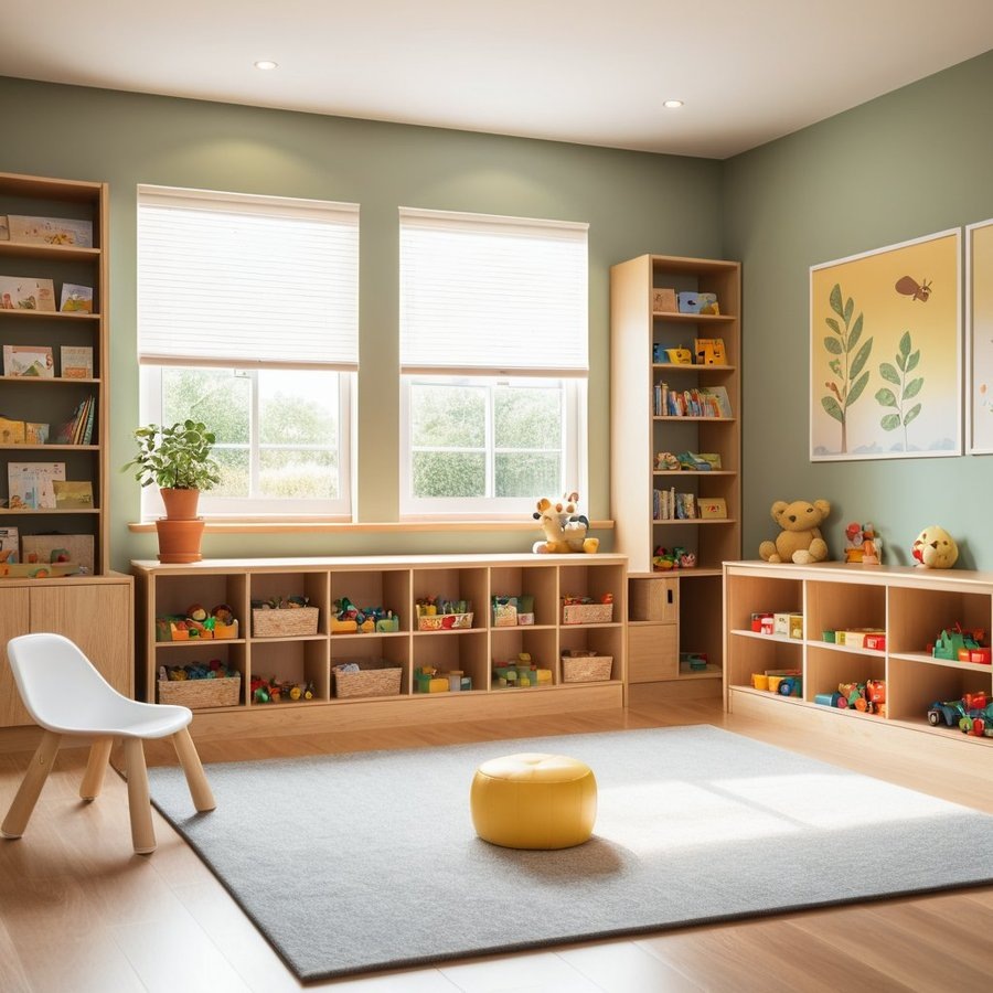 Мебель должна быть низкой и доступной, чтобы ребенок мог легко взаимодействовать с предметами. Размещение элементов должно способствовать естественному движению и обеспечивать свободу передвижения. Яркие и спокойные цвета, а также натуральные материалы создают атмосферу уюта, вдохновляют на творчество и обучение, формируя у ребенка положительное отношение к исследованию окружающего мира.