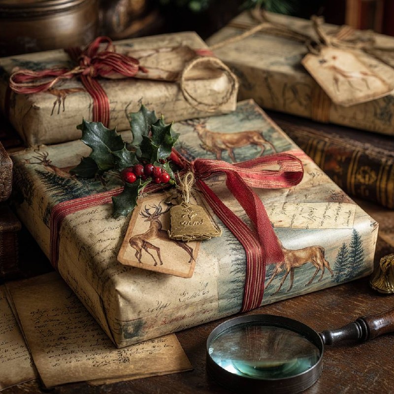 Gifts in paper with old-fashioned illustrations of reindeer and fir trees, tied with wide satin ribbons. Decorations include a sprig of holly with red berries, an old brass bell, and handwritten gift tags. The setting is a worn leather-bound book and an antique magnifying glass. Warm, nostalgic lighting, cinematic style. #MidJourney