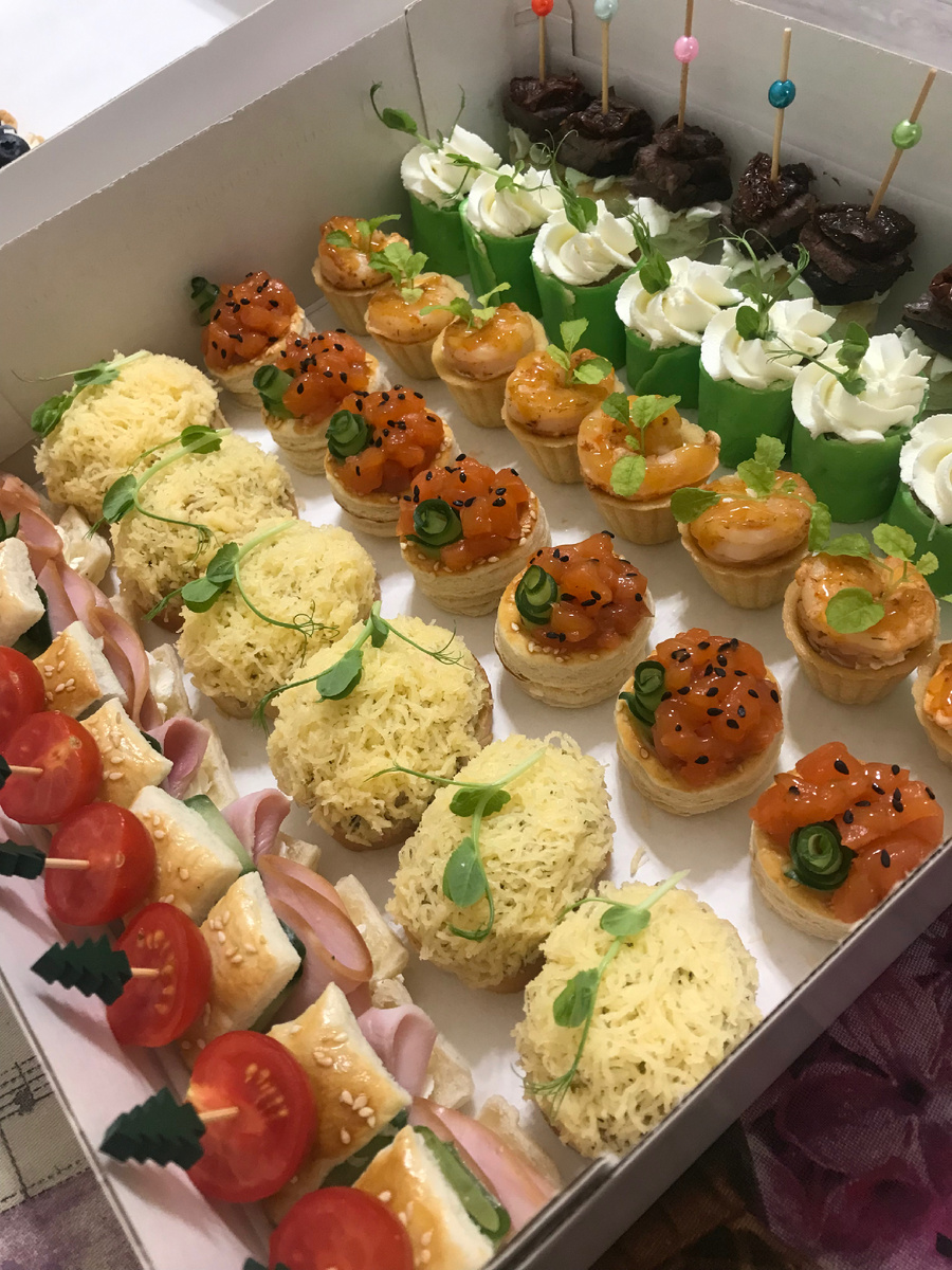 В этом заказе волованы с семгой и шпинатный рулет с огурцом, форелью и творожным сыром. Оч. вкусно)))