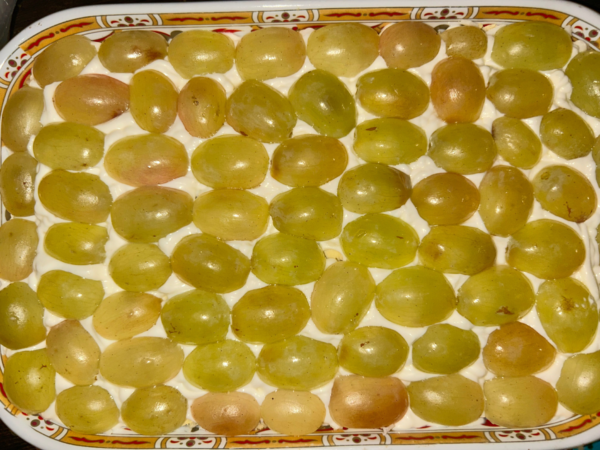 Далее предполагается, что майонез будет только под последним слоем, виноградом. Утверждается, что салат пропитается сверху. Ничего там не пропитается! Настоятельно рекомендую делать сетку майонеза на каждый слой.