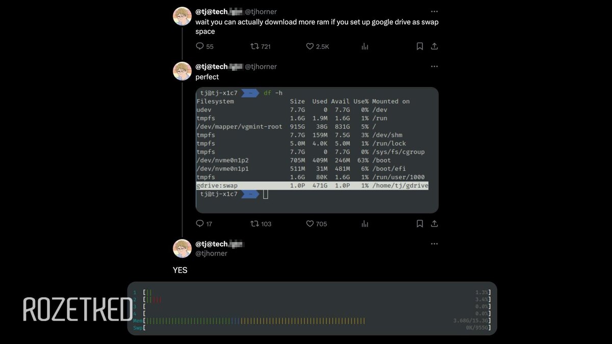 Скачать ОЗУ бесплатно, без регистрации и SMS Если вы переживаете из-за дефицита памяти, в сети есть лайфхак: если у вас Linux, оперативную память можно «скачать» — если использовать «Google Диск» как область подкачки. Производительность будет ужасной, зато платить за ОЗУ больше не придётся 🤩 На самом деле всё это, конечно, баловство. Хотя «Google Диск» действительно можно использовать для виртуальной памяти. Для тех, кто хочет попробовать, есть инструкция. 💼 Rozetked | Подписаться