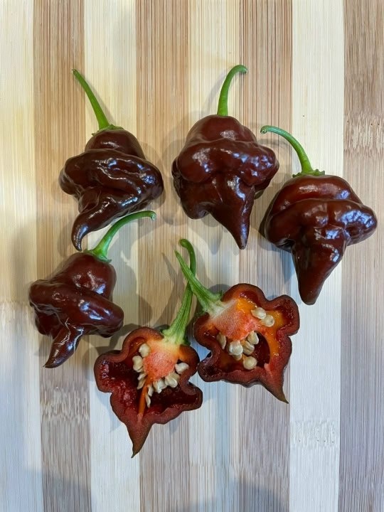Отличный редкий сорт из США., представляющий собой гибрид Chocolate Habanero Long и Black Congo.