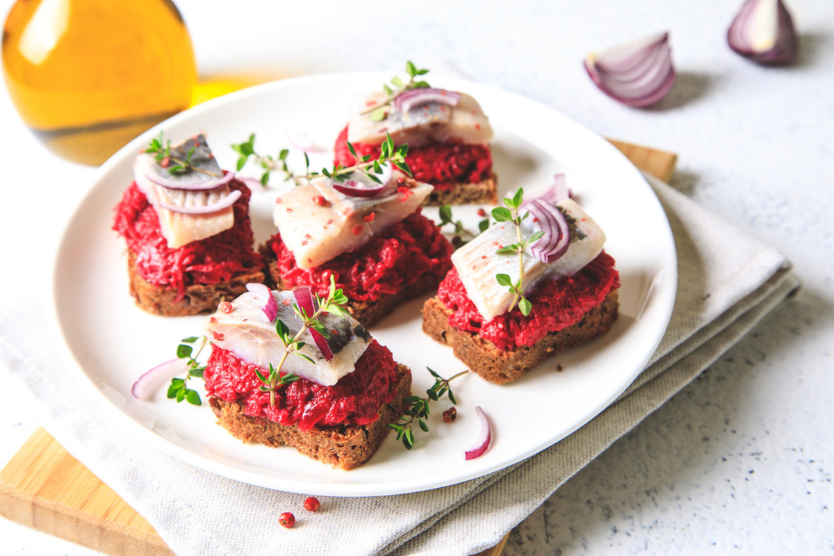Ну что, рыбачки! Все очнулись, проснулись улыбнулись? Врываемся в Новый год с рыбным четвергом! Классическая «Сельдь под шубой» превращается в... необычный сморреброд. Ингредиенты: • картофель – 2 шт. • морковь – 1 шт. • яйца – 2 шт. • свекла – 2 шт. • лук – 1 шт. • бородинский хлеб • оливковое масло • майонез • чеснок • сельдь • укроп Приготовление 1. Подсушиваем кусочки хлеба и натираем их чесноком. 2. Отваренный картофель, свеклу и морковь шинкуем в кухонной машине. Затем смешиваем все с майонезом. 3. Лук и сельдь режем мелким кубиком, соединяем их вместе и добавляем оливковое масло. 4. На хлеб наносим овощную намазку, затем слайсы отваренного яйца, поверх выкладываем сельдь и украшаем все укропом. Если лень готовить, можно побросать на черный хлеб остатки селедки под шубой..ну или другие салаты😎 Подписывайтесь на AVS / Оставляйте бусты