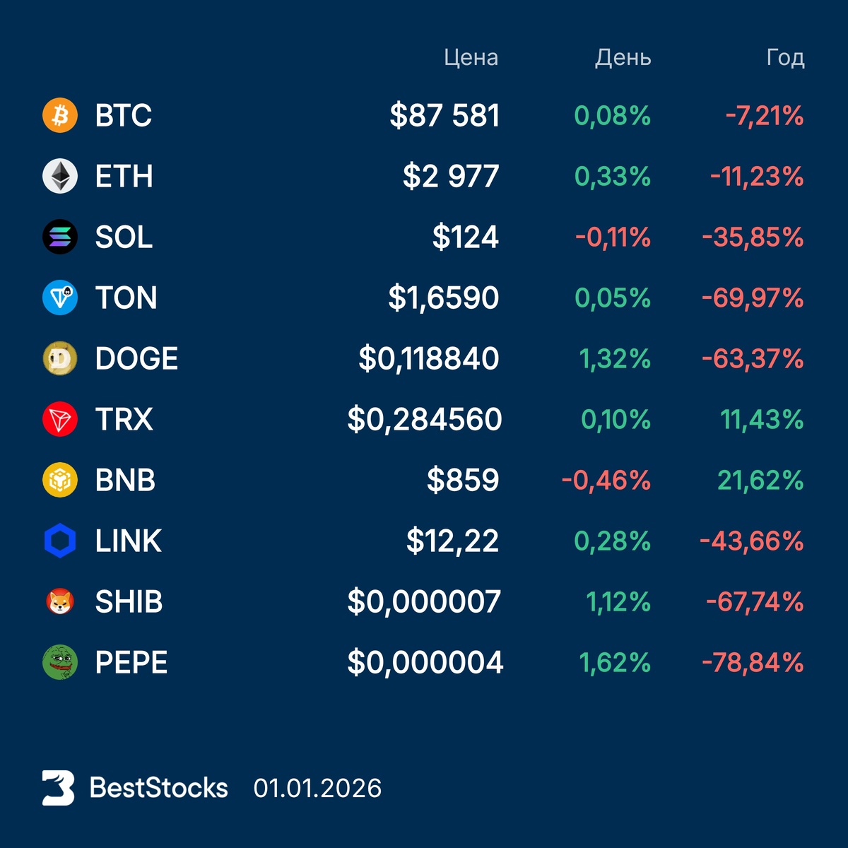 Курсы основных криптовалют: Bitcoin, Etherium, Solana, Toncoin, Dogecoin, TRON, BNB, Chainlink, Pepe, Shiba Inu на текущий момент