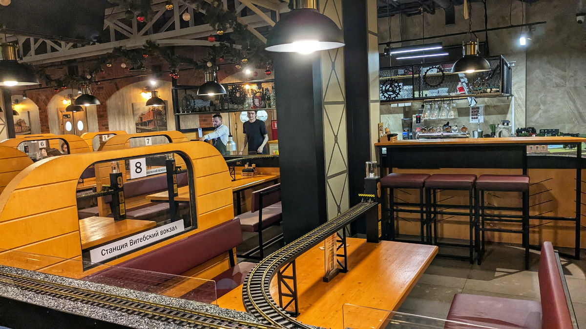 Столики оформлены в виде купе, и над каждым столиком - железнодорожный тупик. Сюда приезжает поезд и привозит ваш заказ.