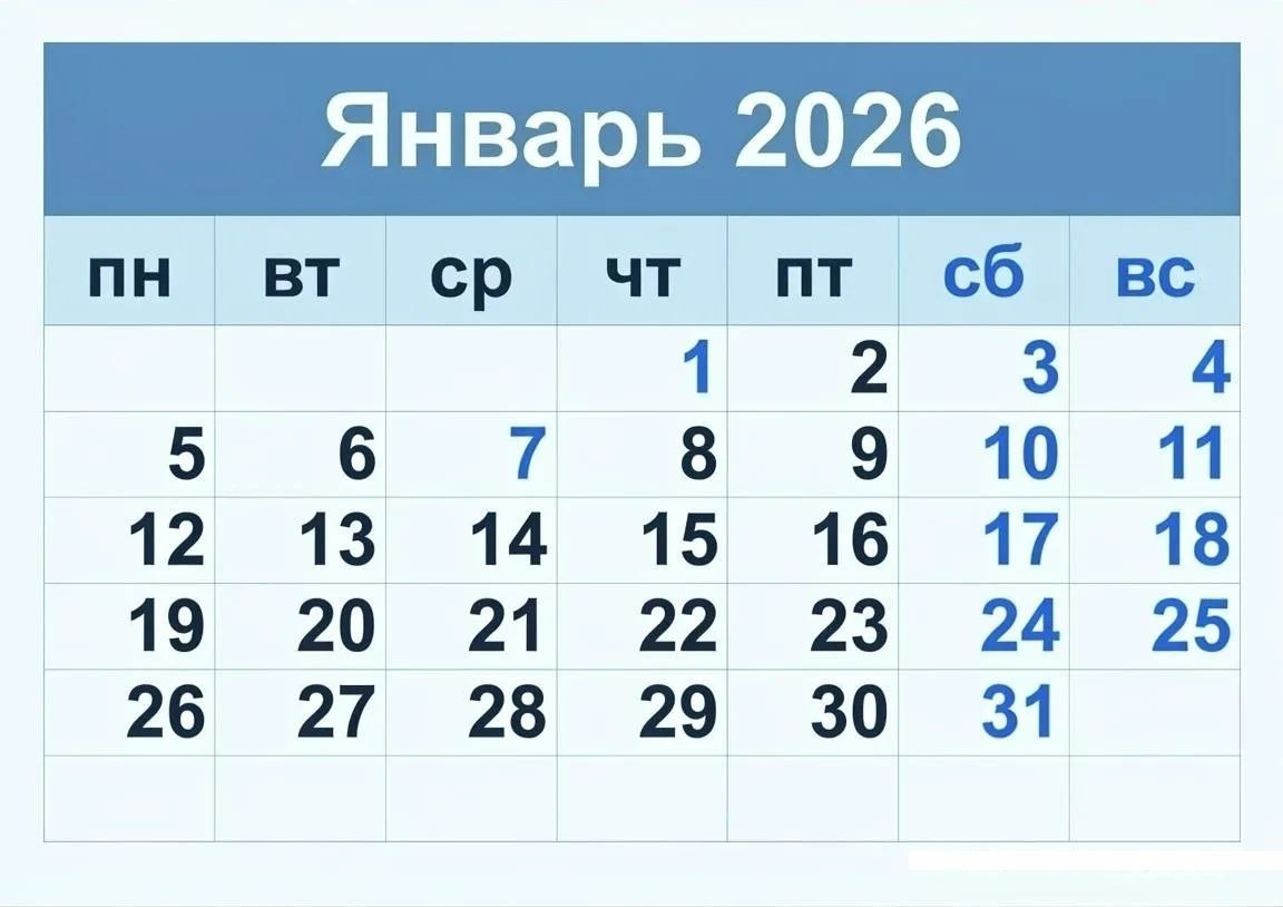 ! В январе 2026 года нас ждёт целых 12 дней отдыха, начиная с 31 декабря 2025 года и заканчивая 11 января 2026 года. Новый год с 1 по 8 января, а также Рождество 7 января. Выходные дни будут перенесены с субботы 3 января на пятницу 9 января. Первый рабочий день наступит 12 января 2026 года, в понедельник. Пусть эти дни будут наполнены радостью, теплом и уютом! Если вы хотите отправиться в путешествие на праздники - билеты ждут вас здесь! 🔵 Ева в MAX