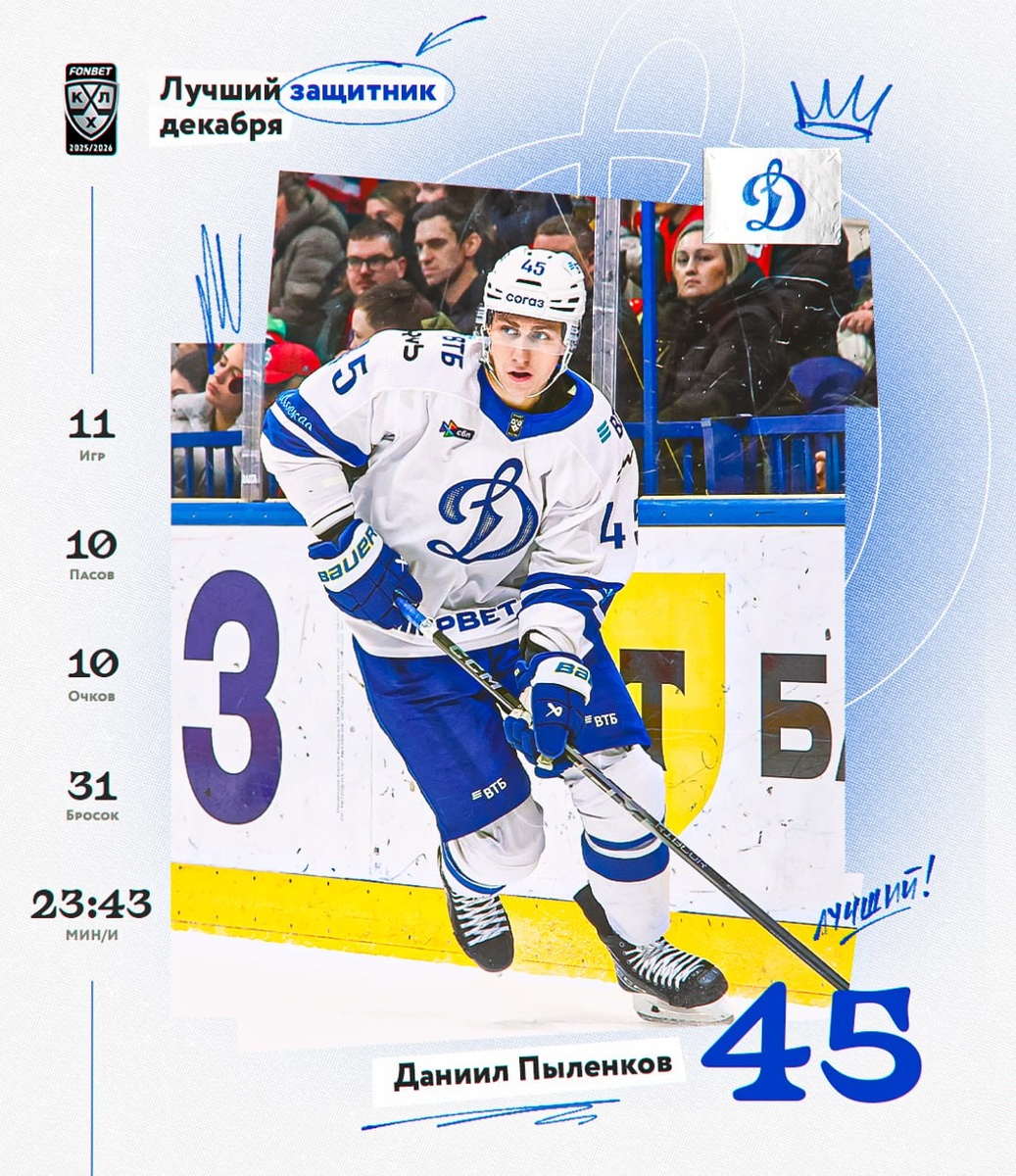 🔵 Даниил Пыленков набрал 10 очков в 11 играх декабря и в третий раз в карьере был признан лучшим защитником месяца в КХЛ!