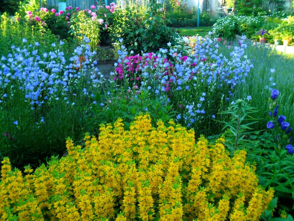Красивое сочетание жёлтого вербейника и персиколистного колокольчика, вот так было, сейчас этой композиции нет.