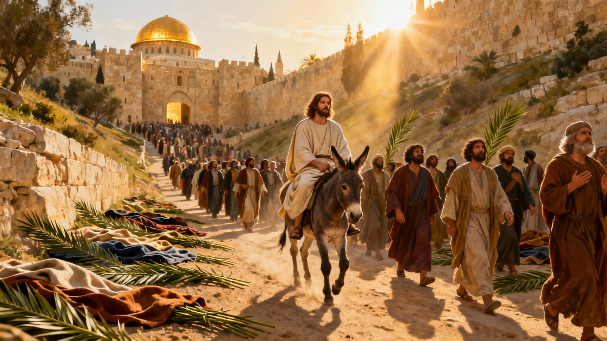 Путь Иисуса начался у берегов Геннисарета. Он прошёл через горы и долины Галилеи, спорные земли Десятиградия и пыльные дороги Иудеи. Его путь завершился на Елеонской горе, откуда открывался вид на Иерусалим. Когда путники приблизились к городу, их взору предстала величественная панорама. За долиной Кедрон сверкали золотом и белым камнем стены и башни Иерусалима. Над всем возвышался величественный храм Ирода. Иисус и Его ученики стояли на склоне Елеонской горы, где, по словам пророка, должна была ступить нога Господа. На пороге последнего акта Своей миссии Иисус действовал с точностью и царственным спокойствием. Он послал двух учеников с детальными указаниями: «Пойдите в селение перед вами. Вы найдёте привязанного молодого осла. Никто на нём не ездил. Отвяжите его и приведите». Ученики, возможно, смутились, но Иисус ответил: «Скажите: он нужен Господу». Эти слова звучали как заявление права. Всё произошло так, как Он предсказал. Ученики нашли осла у ворот и привели его к Иисусу. Они в